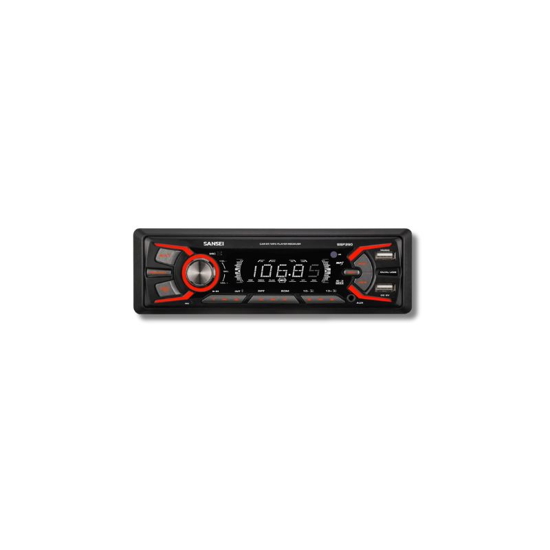 Autoestéreo Sansei con diseño moderno y conectividad completa. Incluye radio AM/FM, Bluetooth integrado y reproducción MP3/WMA mediante USB y AUX. Cuenta con doble puerto USB, salida de 20W x4 y 2 pares de salidas RCA. Ofrece 7 colores de iluminación, ecualizador con 5 modos, controles mute/APS/banda y compatibilidad con la app Eway para un manejo más práctico. Ideal para renovar el audio de tu vehículo.