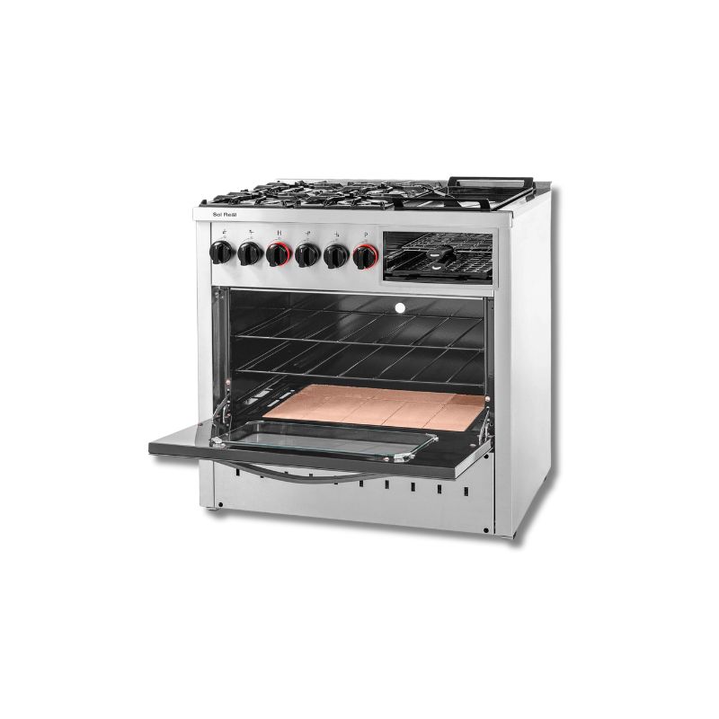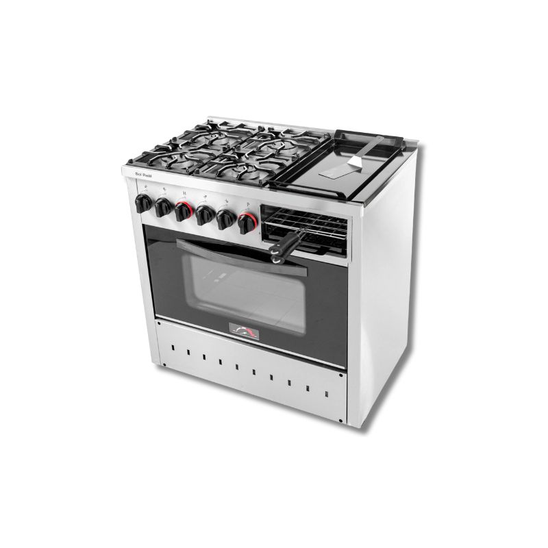 Cocina Industrial Sol Real modelo 900-PVNP, ideal para uso intensivo y resultados profesionales. Cuenta con 4 hornallas, plancha bifera, carlitero y parrilla sin humo, ofreciendo máxima versatilidad. Incluye dos rejillas extraíbles y un gabinete de acero inoxidable esmerilado con interior enlozado y piso de tejuelas refractarias. Equipada con rejas de fundición, válvula de seguridad, puerta de vidrio templado con pirómetro, bandeja colectora de grasa, pinza carlitera y plancha bifera enlozada. Excelente aislación térmica y diseño robusto para un rendimiento confiable y duradero.