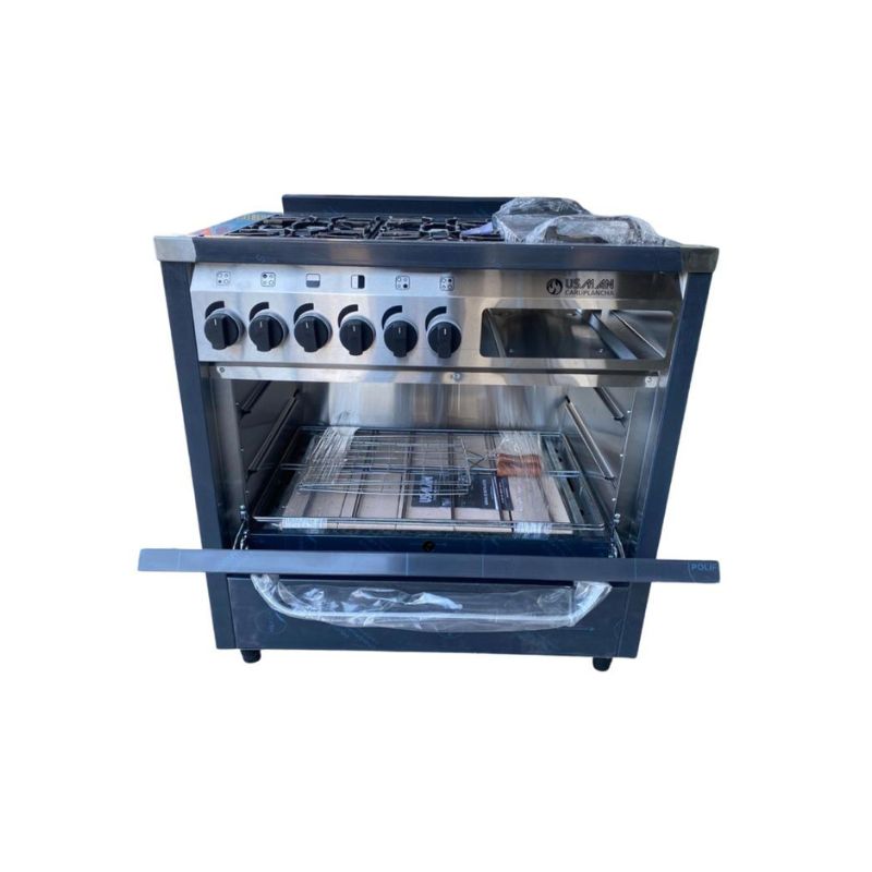 Cocina industrial Usman 4 hornallas con carli+plancha con puerta de horno con vidrio y rejas de fundición.