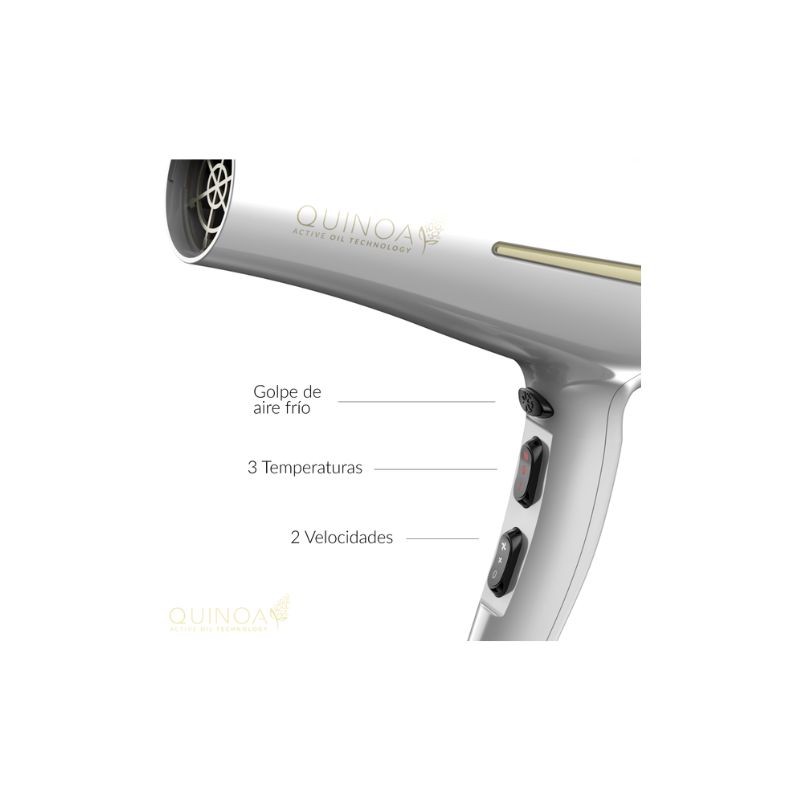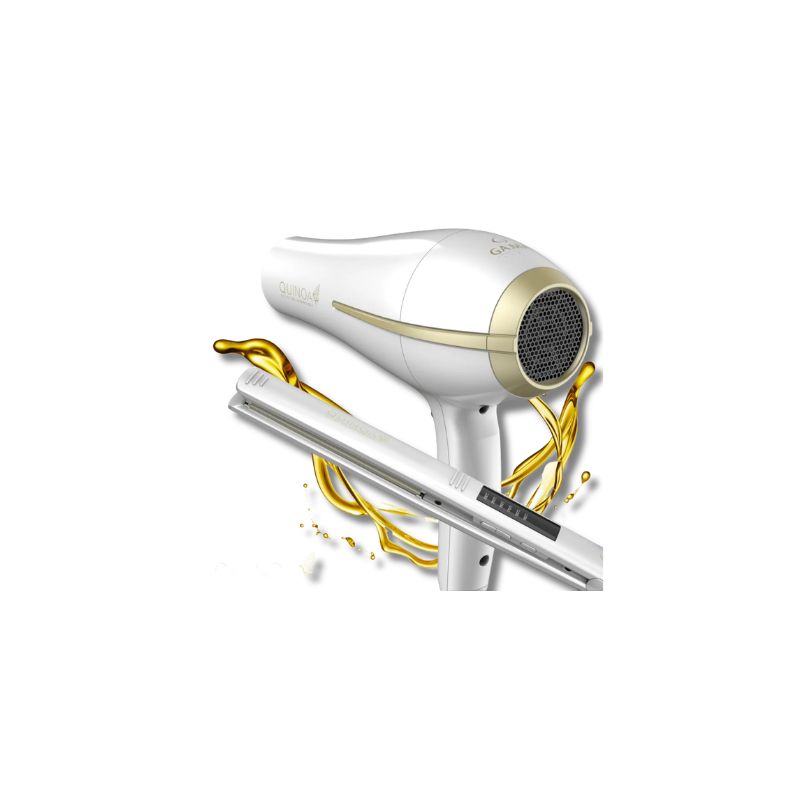 El combo GA.MA Secador Quinoa + Planchita Elegance LED Quinoa es ideal para el cuidado capilar de la línea Essential Oils, diseñado para reparar y proteger el cabello mediante la infusión de proteínas de quinoa.