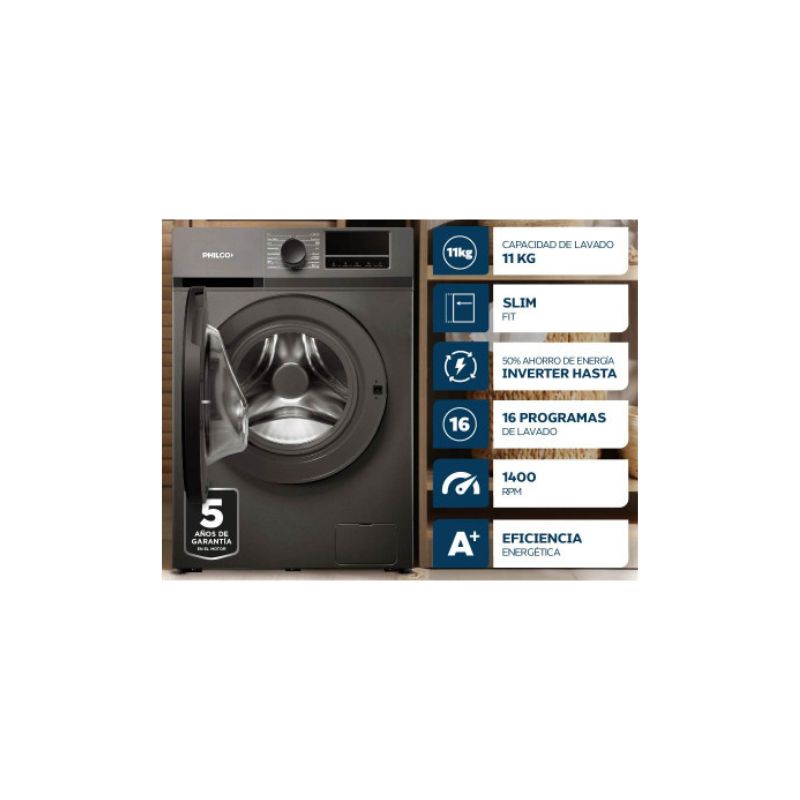 Lavarropas automático Philco carga frontal de 11 kg con motor inverter, ideal para un lavado eficiente y silencioso. Ofrece 16 programas que se adaptan a todo tipo de prendas, con una potente velocidad de 1400 RPM que deja la ropa casi seca. Su diseño moderno en color dark gray, pantalla LED y sistema de lavado europeo brindan practicidad y excelentes resultados, mientras que su eficiencia energética A+ ayuda a reducir el consumo. Incluye bloqueo de seguridad para mayor tranquilidad.